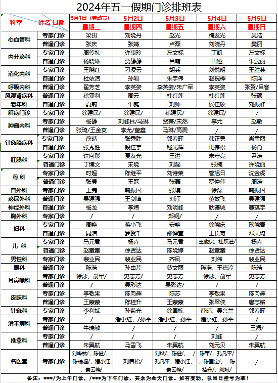 为了方便您就医请您来院前提前预约挂号按照预约时间段提前半小时到达就诊区凭电子挂号单刷码报到现将5月份门诊排班表分享给大家,建议收藏!2024年五一假期门诊排班表...