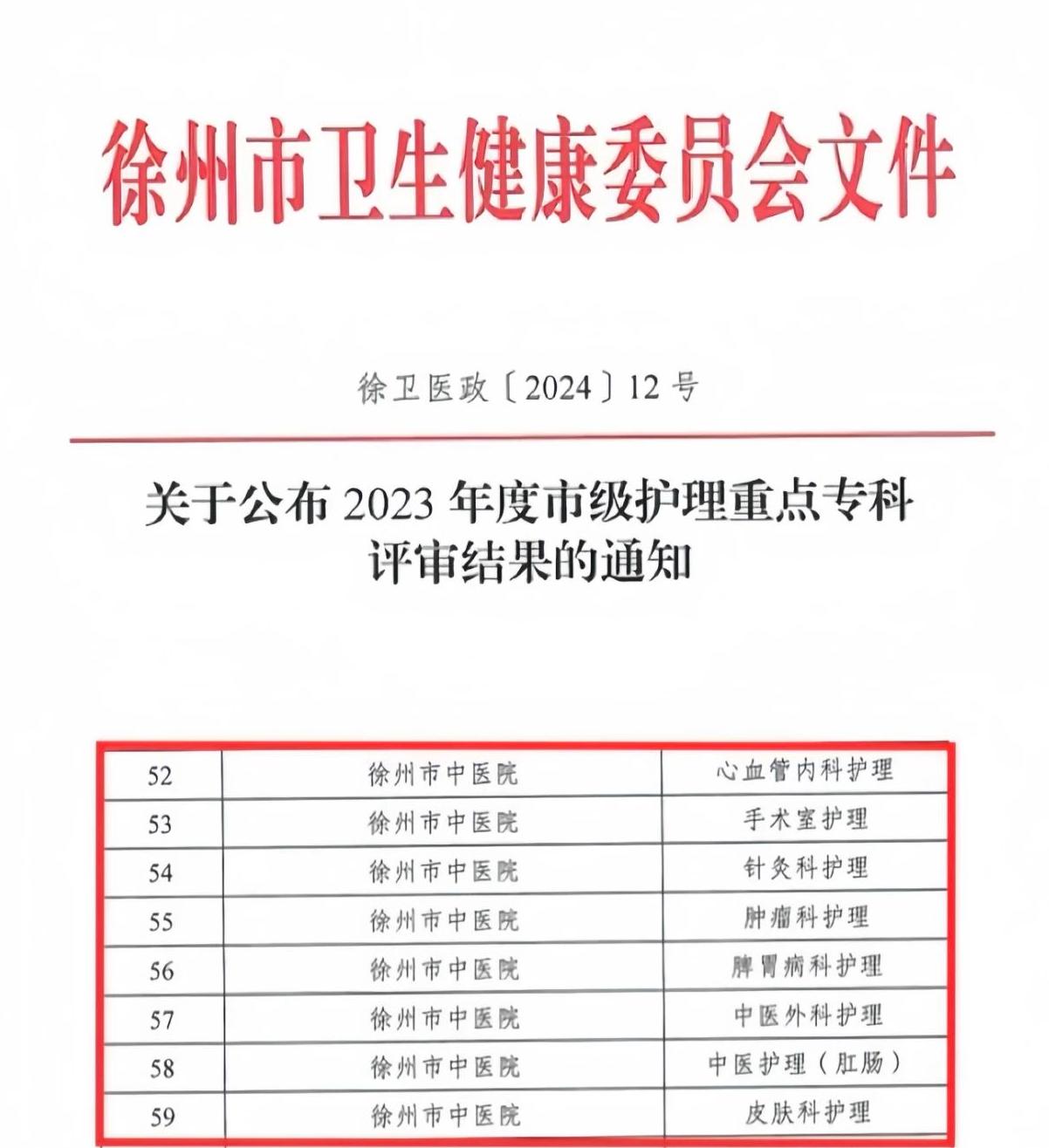 近日,徐州市卫生健康委员会公布了2023年度徐州市市级护理重点专科评审结果,徐州市中医院心血管内科护理、手术室护理、针灸科护理、肿瘤科护理、脾胃病科护理、中医外...