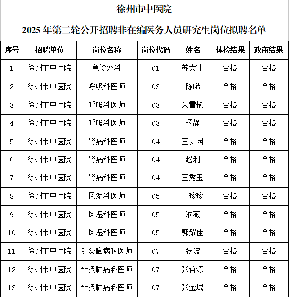 根据《徐州市中医院2025年公开招聘非在编医务人员公告》的有关要求,苏大壮等33名同志经体检、考察后合格,拟聘用,现予以公示(公示时间2025年11月24日-2...