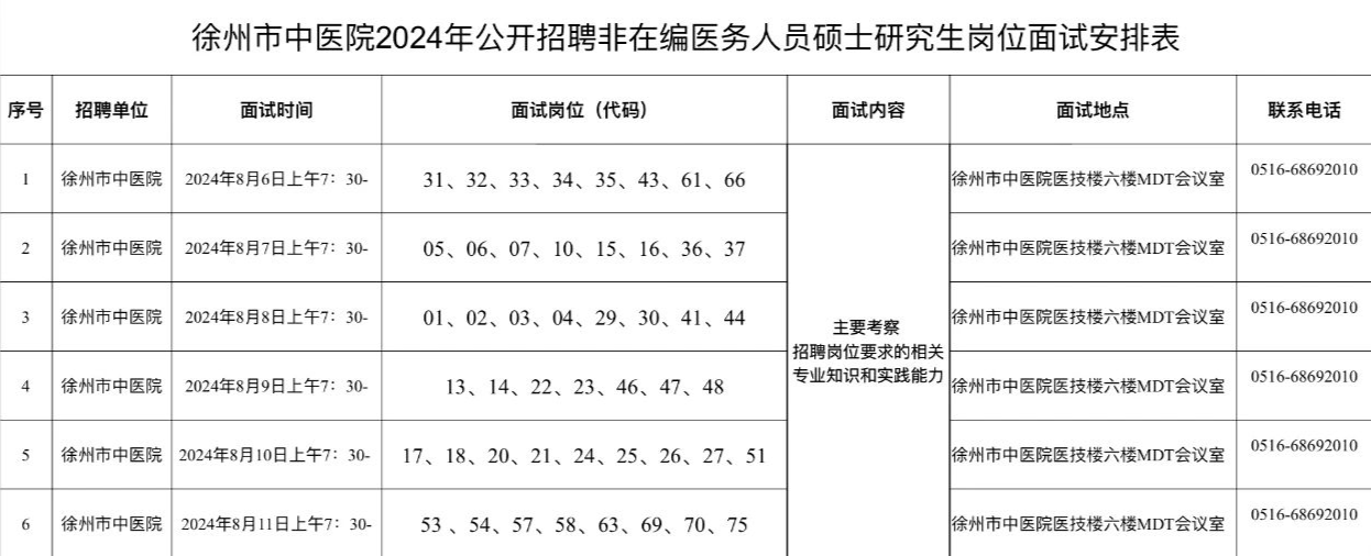 根据《徐州市中医院2024年公开招聘非在编医务人员公告》要求,现将面试时间安排及面试工作公告如下: 一、面试时间 2024年8月6日—20...