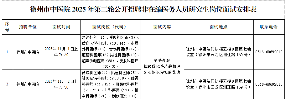 根据《徐州市中医院2025年第二轮公开招聘非在编医务人员公告》要求,现将面试有关事项通知如下: 一、面试时间、地点详见下表 二、注意事项...